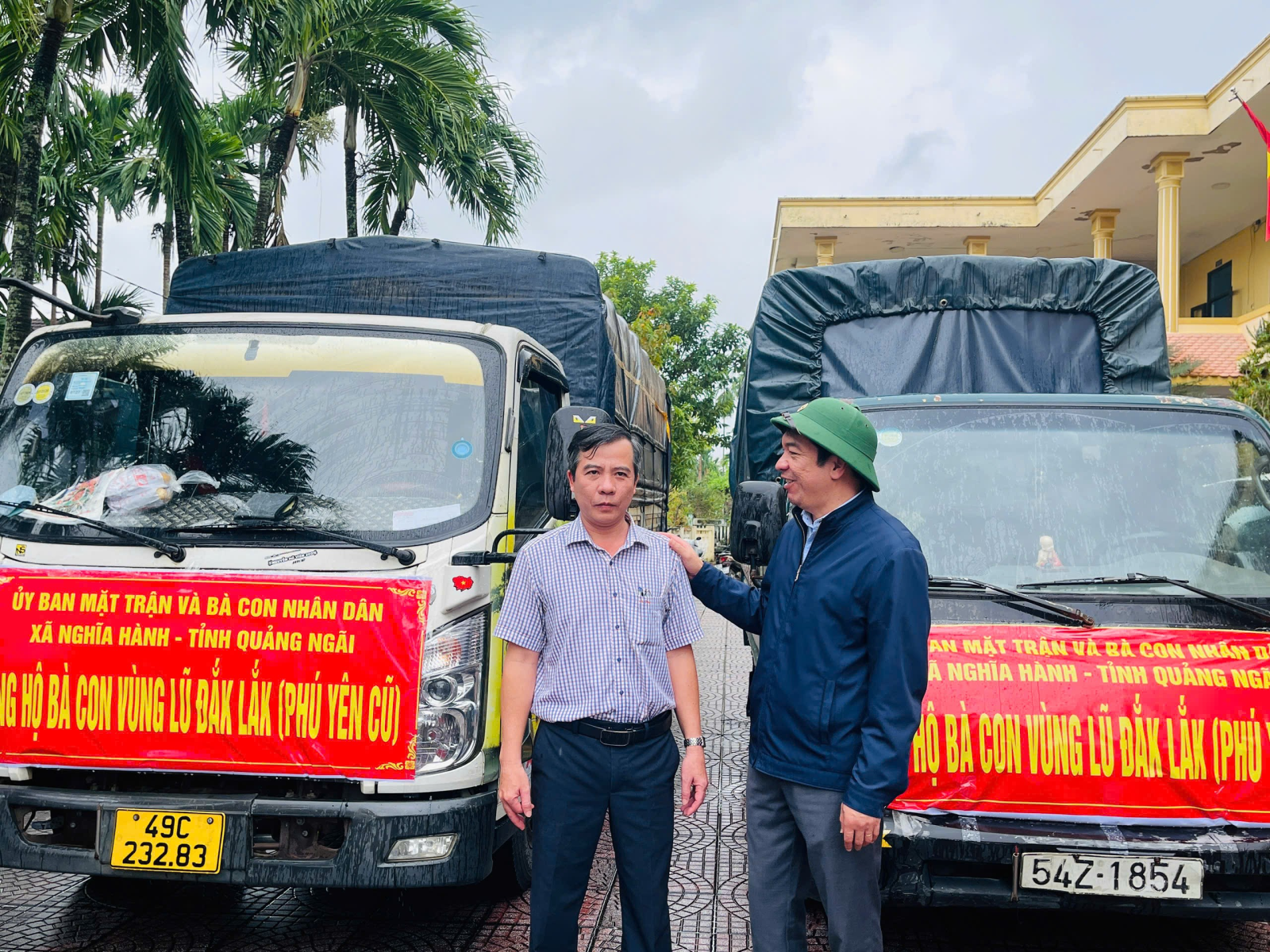 Sáng 24/11/2025, 02 chuyến xe của xã Nghĩa Hành đã xuất phát vận chuyển 01 tấn gạo, 200 thùng mì, 50 thùng nước uống đóng chai, bánh ngọt, thức ăn sẵn đóng gói các loại; 01 tấn quần áo chăn màn… (trị giá 200 triệu đồng) do nhân dân và cán bộ xã Nghĩa Hành đóng góp, vào hỗ trợ bà con bị thiệt hại do lũ lụt ở xã Hoà Phú 1, Hoà Phú 2 (thuộc tỉnh Phú Yên cũ, nay là tỉnh Đắk Lắk).